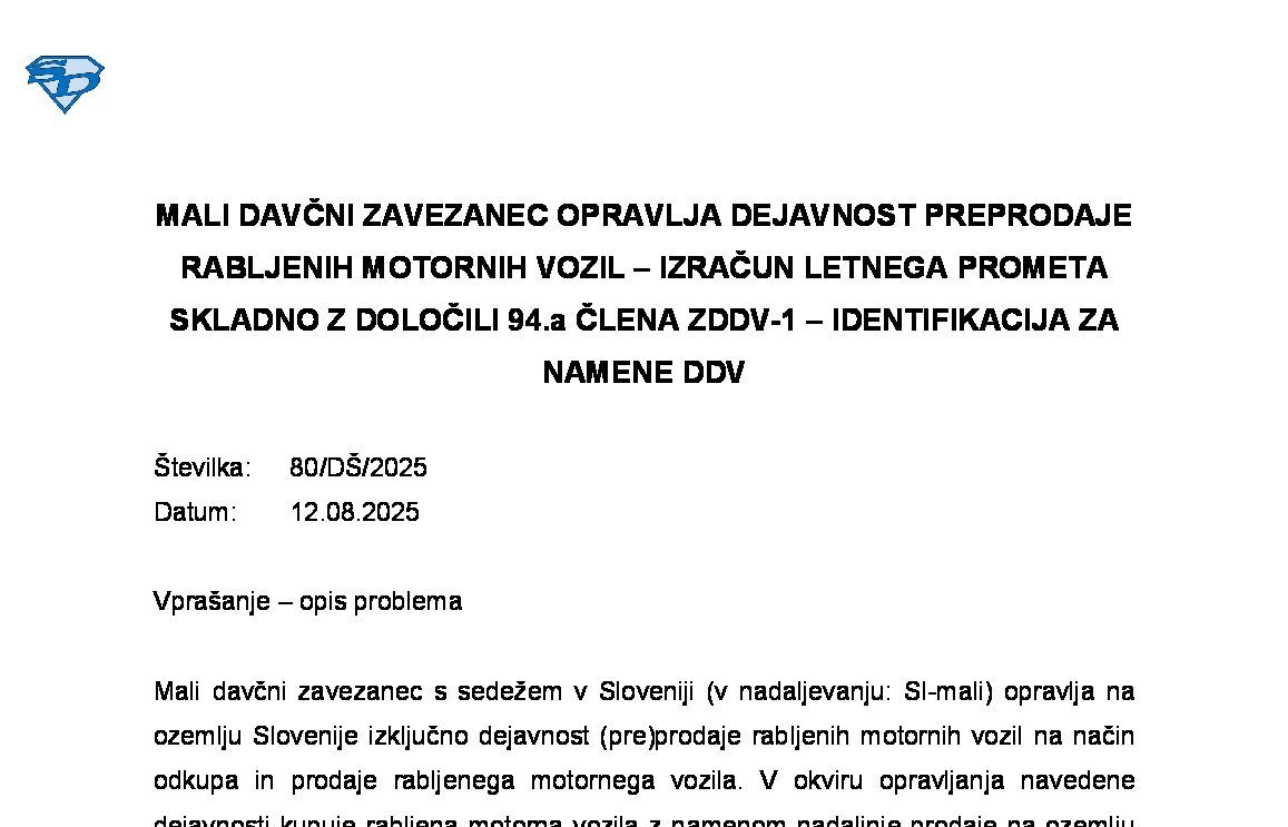 PRIDOBITEV IDENTIFIKACIJSKE ŠTEVILKE ZA DDV PRI MALEM DAVČNEM ZAVEZANCU – NAKUPI RABLJENEGA BLAGA OD OBDAVČLJIVIH PREPRODAJALCEV IZ DRUGIH DRŽAV ČLANIC EU – Ali preseganje nakupov v vrednosti 10.000 EUR pomeni obveznost za identifikacijo za DDV? 27.11.2025 27.11.2025