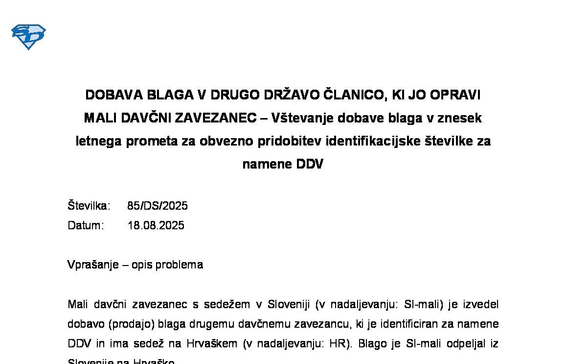 PRIDOBITEV IDENTIFIKACIJSKE ŠTEVILKE ZA DDV PRI MALEM DAVČNEM ZAVEZANCU – NAKUPI RABLJENEGA BLAGA OD OBDAVČLJIVIH PREPRODAJALCEV IZ DRUGIH DRŽAV ČLANIC EU – Ali preseganje nakupov v vrednosti 10.000 EUR pomeni obveznost za identifikacijo za DDV? 27.11.2025 27.11.2025