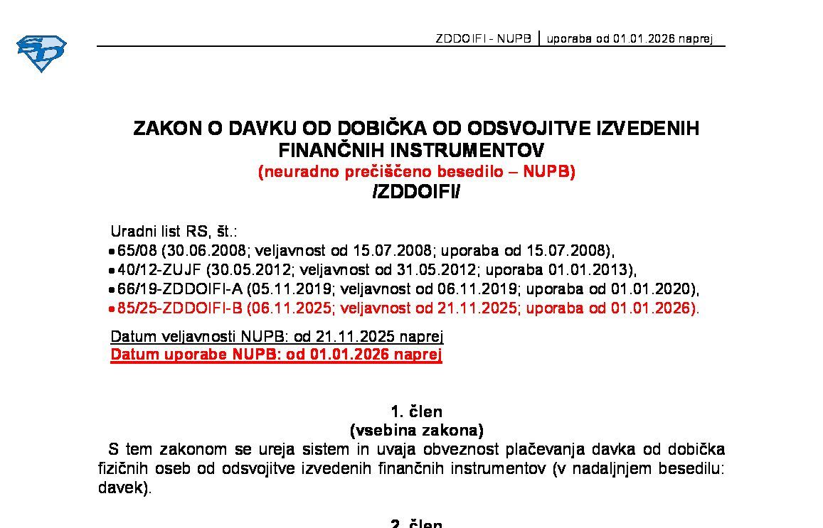 | ZAKON O DAVKU OD DOBIČKA OD ODSVOJITVE IZVEDENIH FINANČNIH INSTRUMENTOV (ZDDOIFI - neuradno prečiščeno besedilo) | 01.01.2020 | 31.12.2025 | 06.11.2019 | |