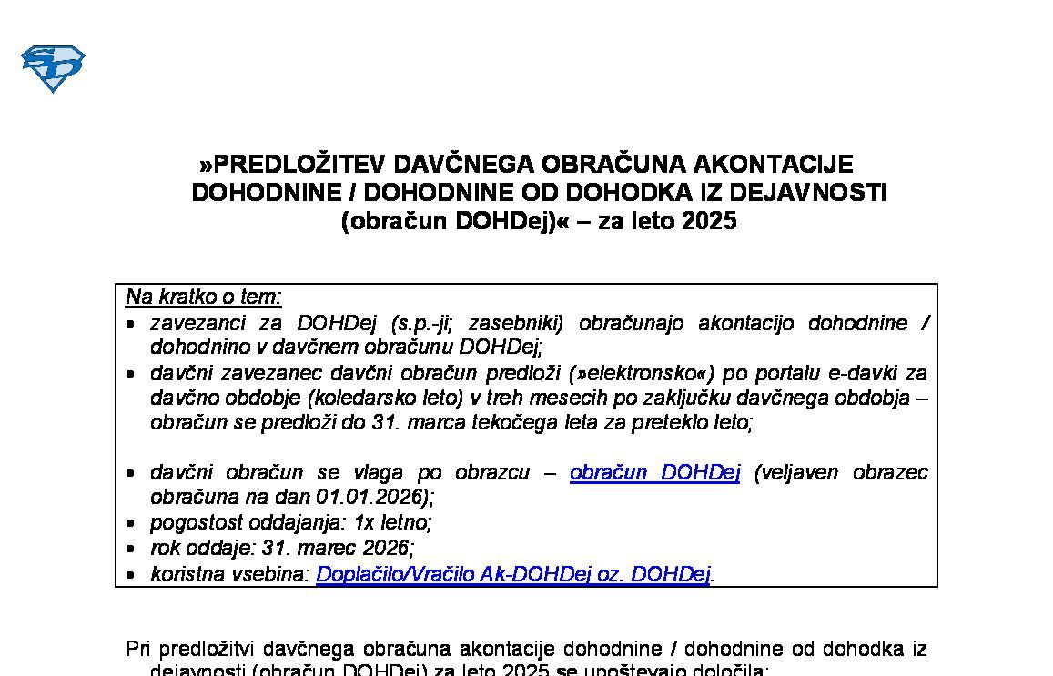 PLAČEVANJE PREDHODNE AKONTACIJE DOHODNINE / AKONTACIJE DOHODNINE OD DOHODKA IZ DEJAVNOSTI (obračun DOHDej) – v letu 2026 12.12.2025