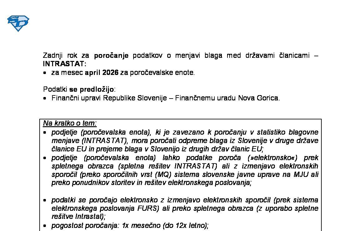Poročanje podatkov o menjavi blaga med državami članicami EU - INTRASTAT 2026-10-15 00:00:00