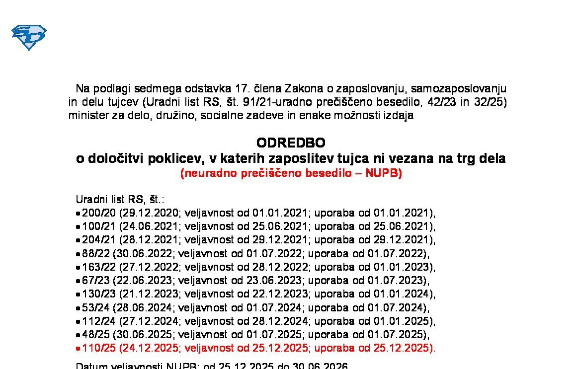 Odredba o določitvi poklicev, v katerih zaposlitev tujca ni vezana na trg dela (NUPB - neuradno prečiščeno besedilo) 01.07.2025 24.12.2025 01.07.2025