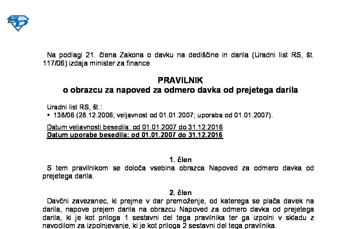 Pravilnik o napovedi davka na darilo 01.01.2017 [!] 12.01.2017