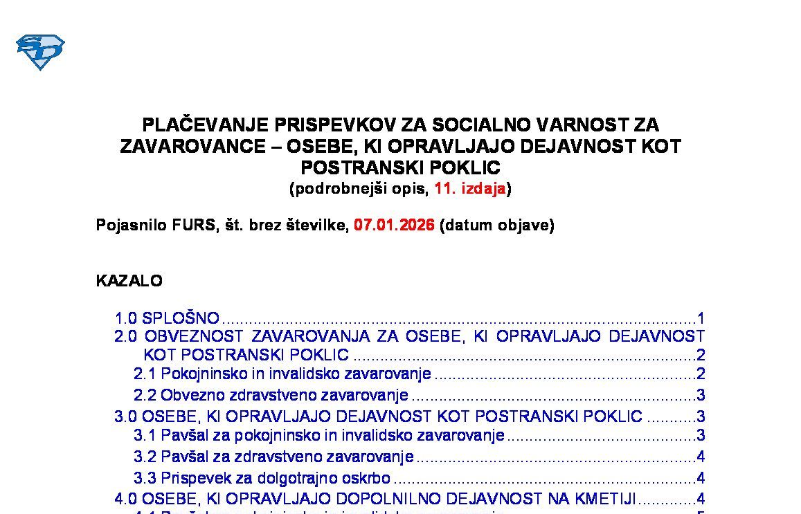 PRISPEVKI ZA SOCIALNO VARNOST – Brošura o plačevanju prispevkov za socialno varnost (podrobnejši opis, 15. izdaja) 08.01.2026 15.01.2026