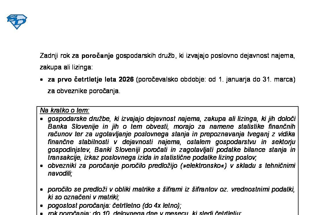 Poročanje Banki Slovenije - poročilo gospodarskih družb, ki izvajajo poslovno dejavnost najema, zakupa ali lizinga 2026-01-16 00:00:00