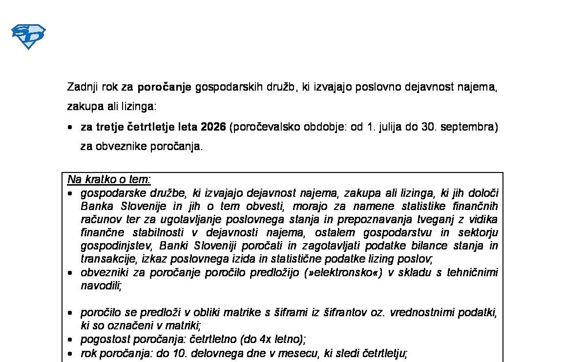 Poročanje Banki Slovenije - poročilo gospodarskih družb, ki izvajajo poslovno dejavnost najema, zakupa ali lizinga 2026-01-16 00:00:00