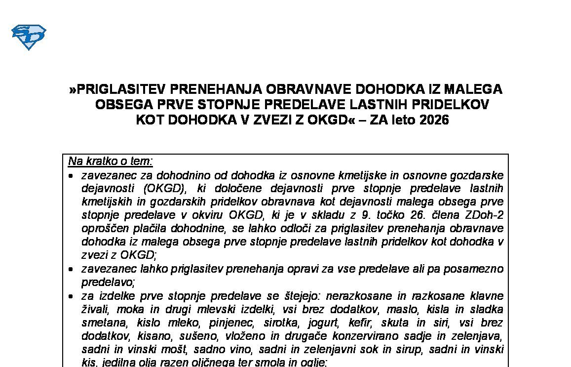 PRIGLASITEV OBRAVNAVE DOHODKA IZ MALEGA OBSEGA PRVE STOPNJE PREDELAVE LASTNIH PRIDELKOV KOT DOHODKA V ZVEZI Z OKGD – ZA leto 2026 28.01.2026
