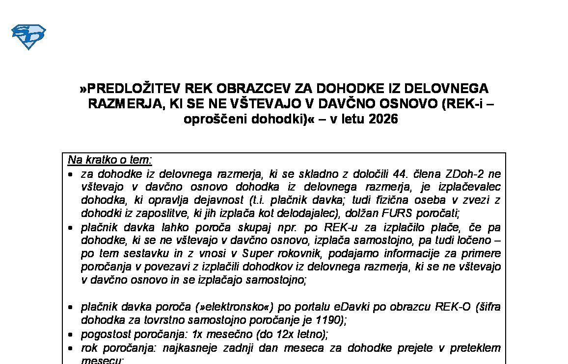 DOSTAVA PODATKOV O (DENARNIH) DOHODKIH, OPROŠČENIH PLAČILA DOHODNINE - ZA leto 2025 30.01.2026