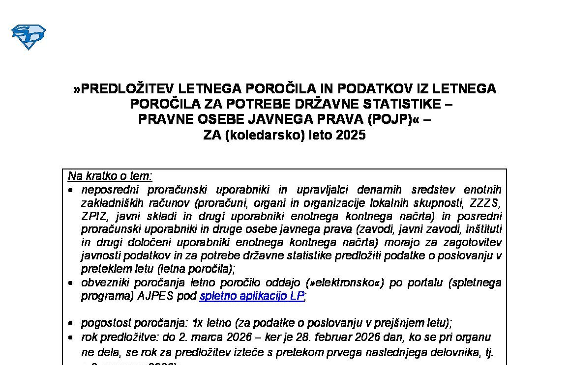 PREDLOŽITEV LETNEGA POROČILA IN PODATKOV IZ LETNEGA POROČILA ZA POTREBE DRŽAVNE STATISTIKE – PRAVNE OSEBE ZASEBNEGA PRAVA (POZP) - ZA (koledarsko) leto 2025 03.02.2026