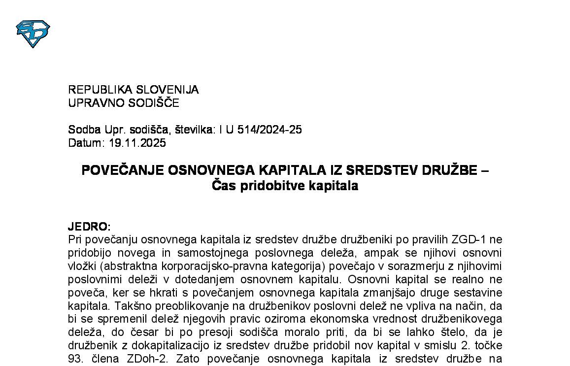 PREJEM POSLOVNEGA DELEŽA V DRUŽBI OB ANGAŽIRANJU PRI SANACIJI DRUŽBE – Darilo, ki se obdavčuje po ZDDD, ali dohodek obdavčen po ZDoh-2 (I U 1495/2022-13) 20.11.2024 10.07.2025