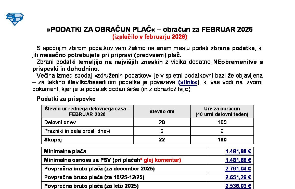 PODATKI ZA OBRAČUN PLAČ – obračun za FEBRUAR 2026 (izplačilo v mar-2025) 17.02.2026