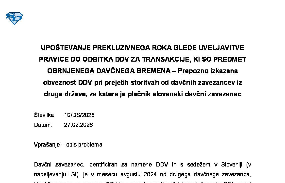 PRAVICA DO ODBITKA DDV NA PODLAGI POPRAVLJENEGA RAČUNA V PRIMERU NAKNADNE IDENTIFIKACIJE DOBAVITELJA ZA NAMENE DDV ZARADI PRESEŽENEGA PRAGA LETNEGA PROMETA NA OZEMLJU SLOVENIJE 17.04.2026 17.04.2026