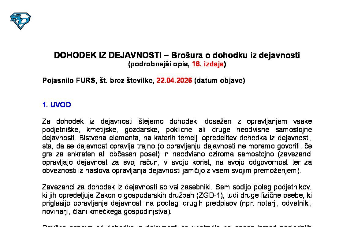 DOHODEK IZ DEJAVNOSTI – Brošura za davčne zavezance, ki opravljajo dejavnost – začetnike (podrobnejši opis, 8. izdaja) 01.04.2026 02.04.2026