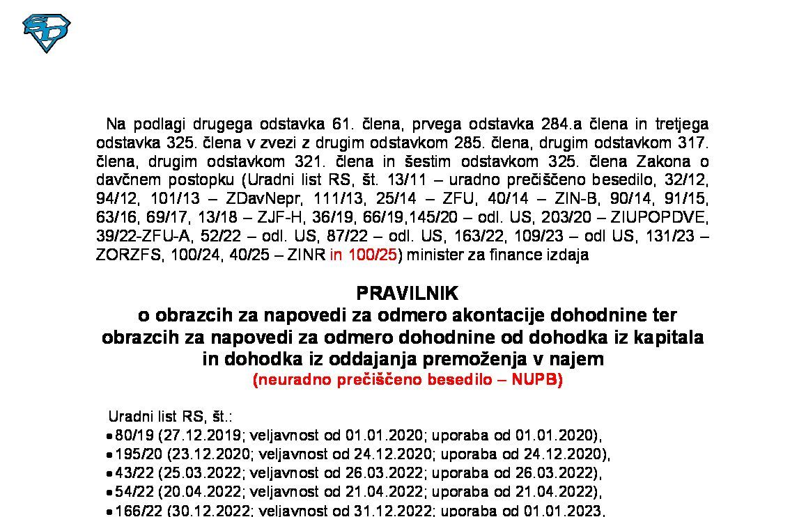 Pravilnik o dostavi podatkov za odmero dohodnine ('dostava-obdavčljivi dohodki' - neuradno prečiščeno besedilo) 01.01.2025 [!] 26.11.2025