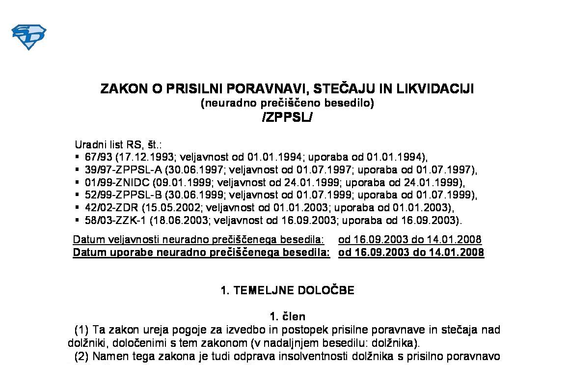 | ZAKON O FINANČNEM POSLOVANJU, POSTOPKIH ZARADI INSOLVENTNOSTI IN PRISILNEM PRENEHANJU (ZFPPIPP - neuradno prečiščeno besedilo) | 01.11.2023 | [!] | 18.06.2025 | 09.10.2023 |