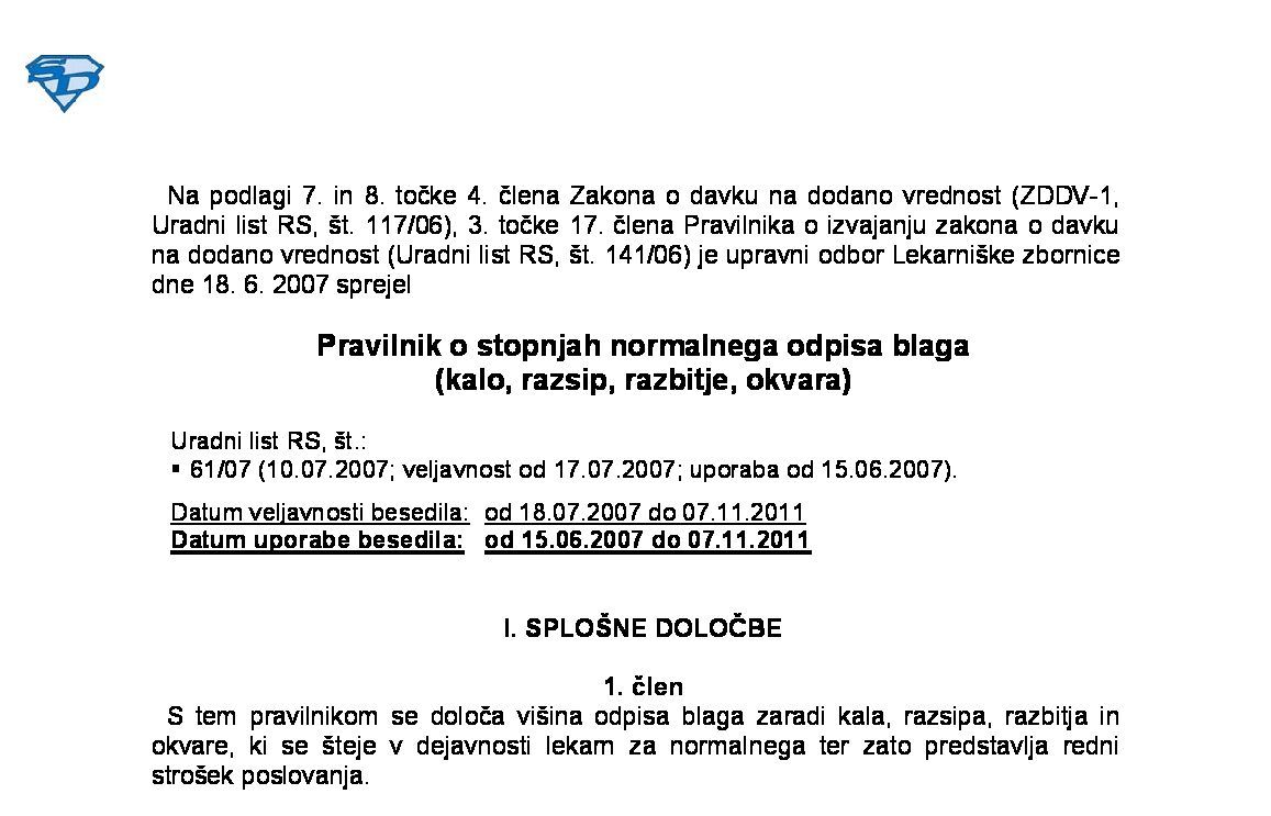 Pravilnik o stopnjah normalnega odpisa blaga (kalo, razsip, razbitje, okvara) - LEKARNE 08.11.2011 08.11.2011