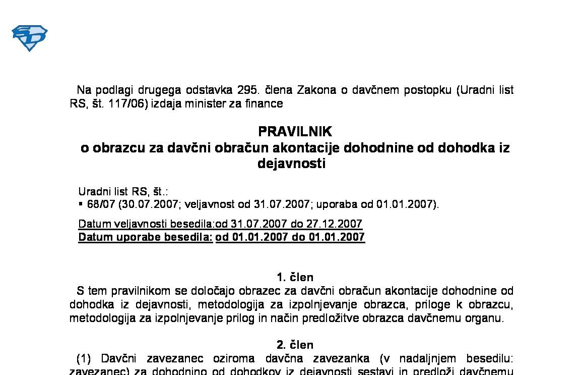 Uporablja se za obračun akontacije dohodnine od dohodka iz dejavnosti, ki vključuje obdobje od 1. januarja 2007 naprej in je odddan DO vključno 27.12.2007. Priloga 1 - Davčni obračun akontacije dohodnine od dohodka iz dejavnosti (MF-DURS obr. DOHDEJ št. 18).pdf