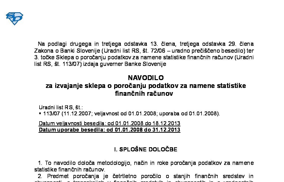 Navodilo za izvajanje Sklepa o poročanju podatkov za namene statistike finančnih računov (Navodilo-SFR) 01.01.2014 24.12.2013