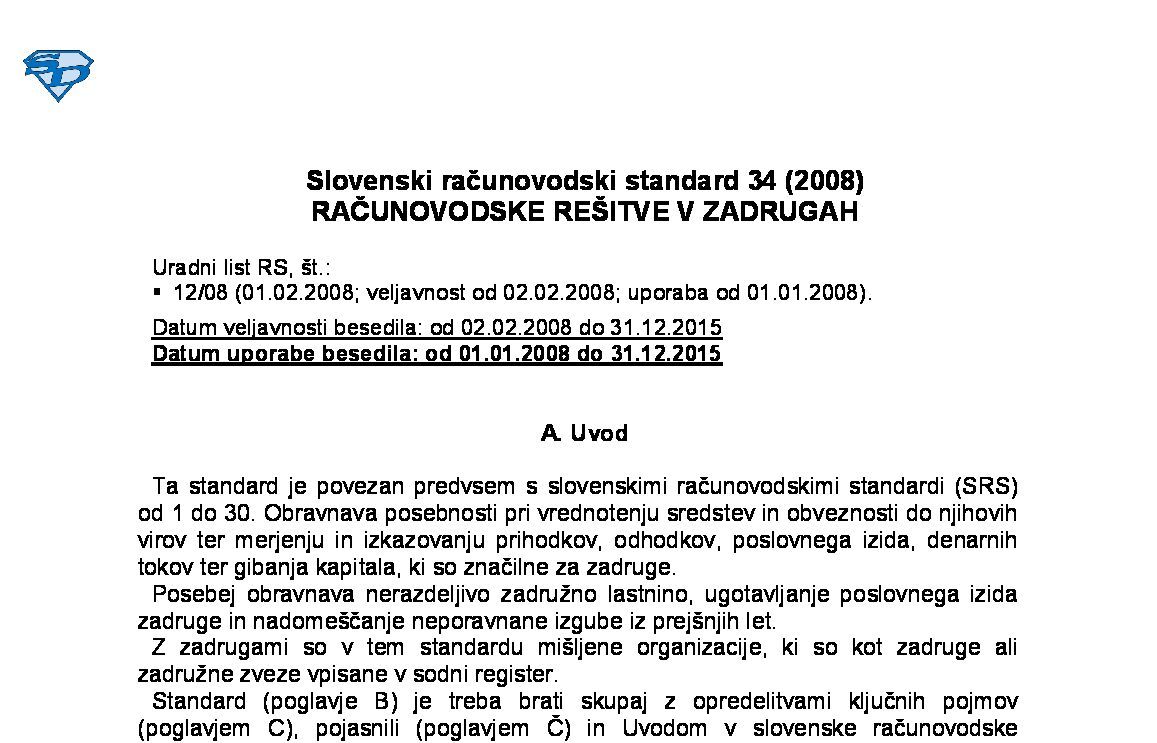 Zadruge z dnem začetka uporabe SRS 31 (2016) prenehajo uporabljati SRS 34 − Računovodske rešitve v zadrugah (2008).