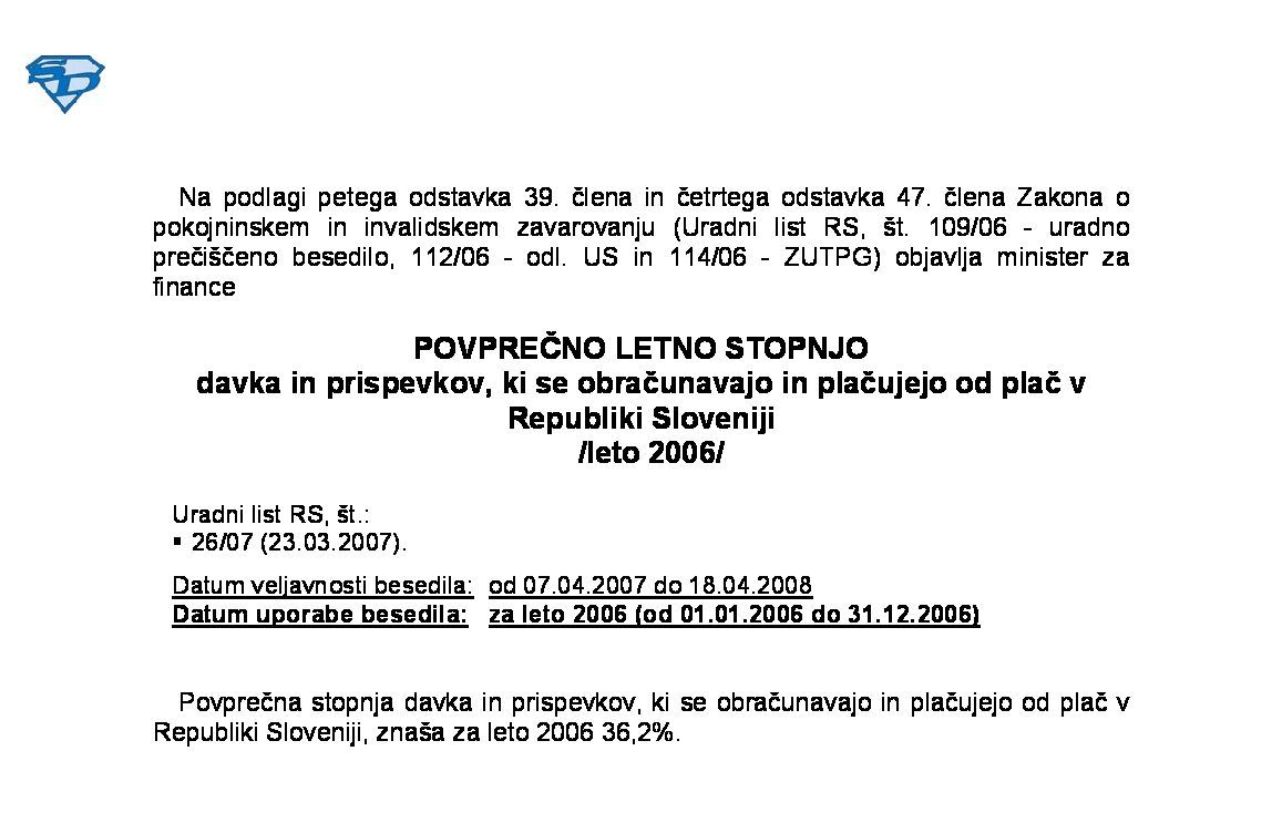 | Povprečna letna stopnja davka in prispevkov, ki se obračunavajo in plačujejo od plač v Republiki Sloveniji (leto 2023) | 01.01.2023 | 31.12.2023 | 11.03.2024 | |