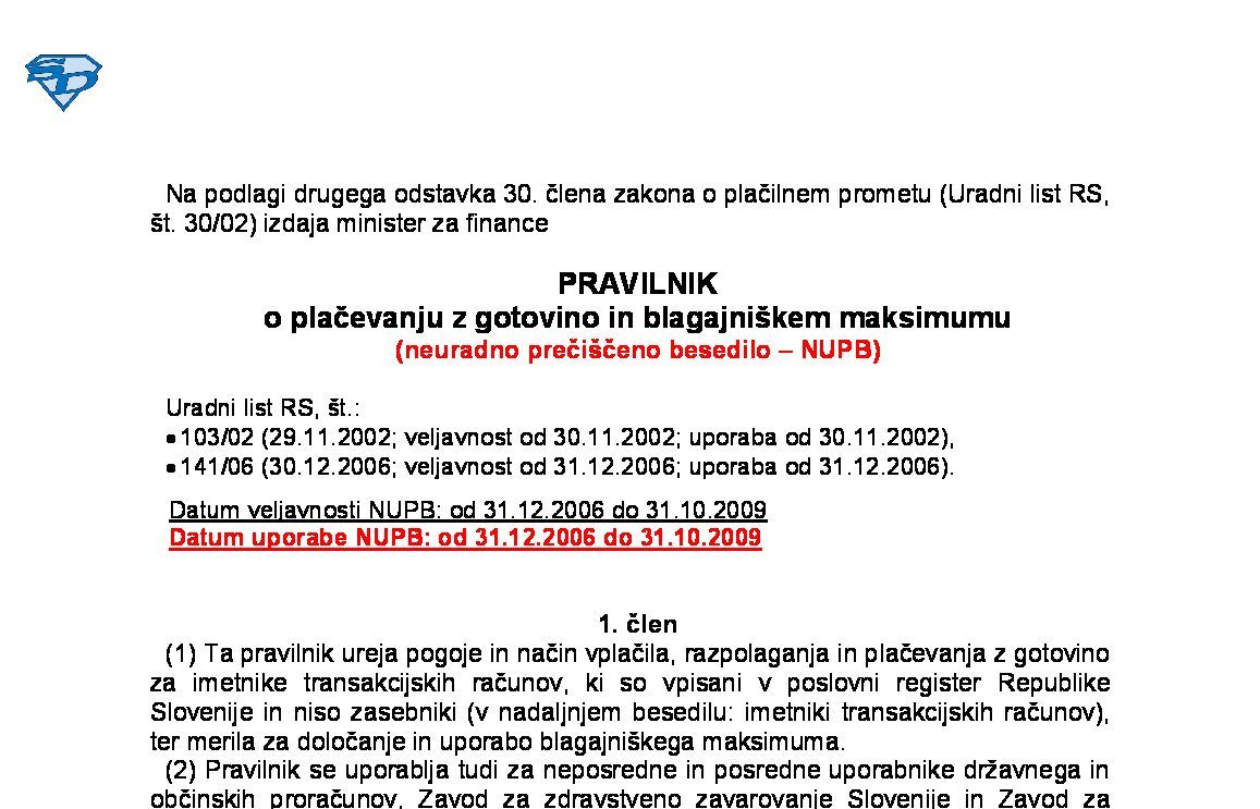 Posebnost glede uporabe (241. člen prehodnih in končnih določb ZPIaSS) - 30. člen ZPIaP in predpis, izdan na njegovi podlagi, se uporablja do izdaje novega predpisa, ki ureja poslovanje z gotovino, oziroma najkasneje do 1. januarja 2010. |