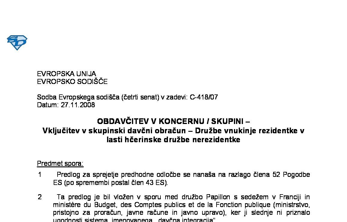 SKUPNI SISTEM OBDAVČITVE MATIČNIH DRUŽB IN ODVISNIH DRUŽB IZ RAZLIČNIH DRŽAV ČLANIC – Oprostitev DDPO od dividend, ki jih odvisna družba nerezidentka razdeli matični družbi rezidentki (C-228/24) 03.04.2025 07.04.2025