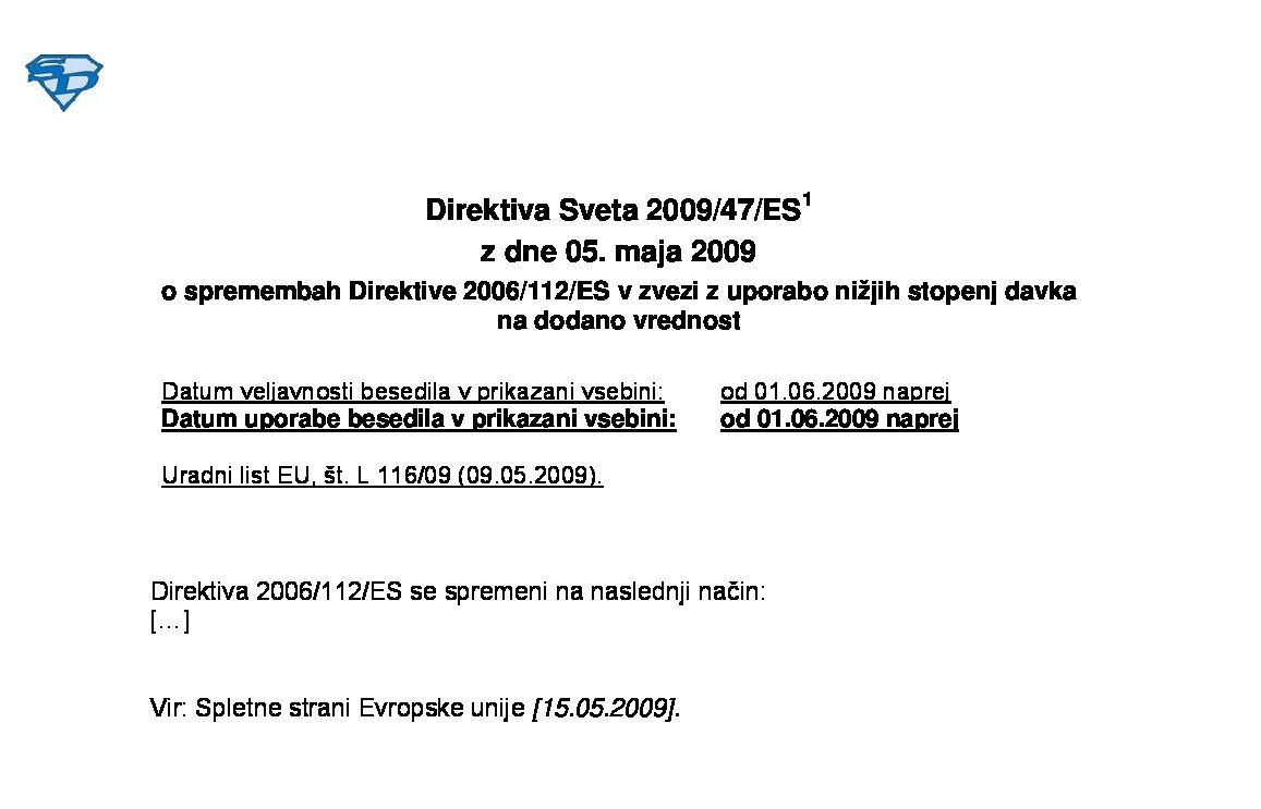 Članek nima posebnosti! DIREKTIVA SVETA 2009/47/ES z dne 05.05.2009 o spremembah Direktive Sveta 2006/112/ES v zvezi z uporabo nižjih stopenj DDV.pdf