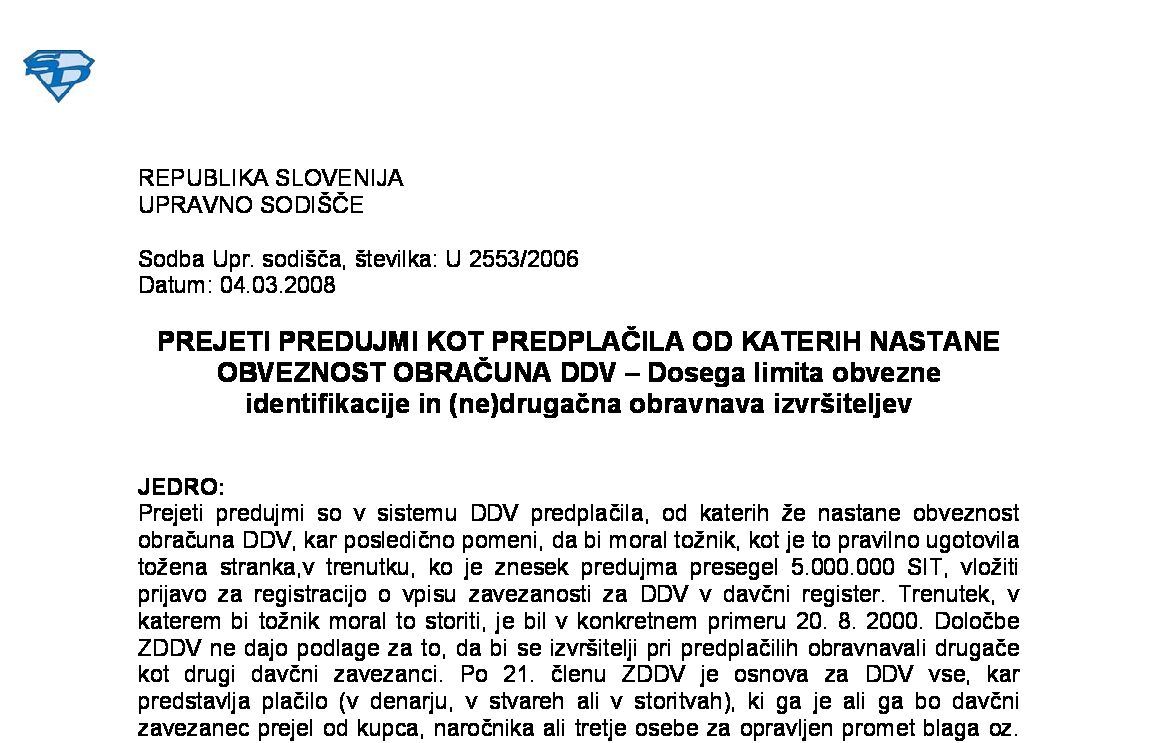 IZPOLNJEVANJE POGOJEV ZA DOBAVO BLAGA ZNOTRAJ UNIJE, OPROŠČENO PLAČILA DDV NA PODLAGI 46. ČLENA ZDDV-1 – Nepopolne CMR listine (I U 1704/2021-38) 27.11.2024 15.10.2025