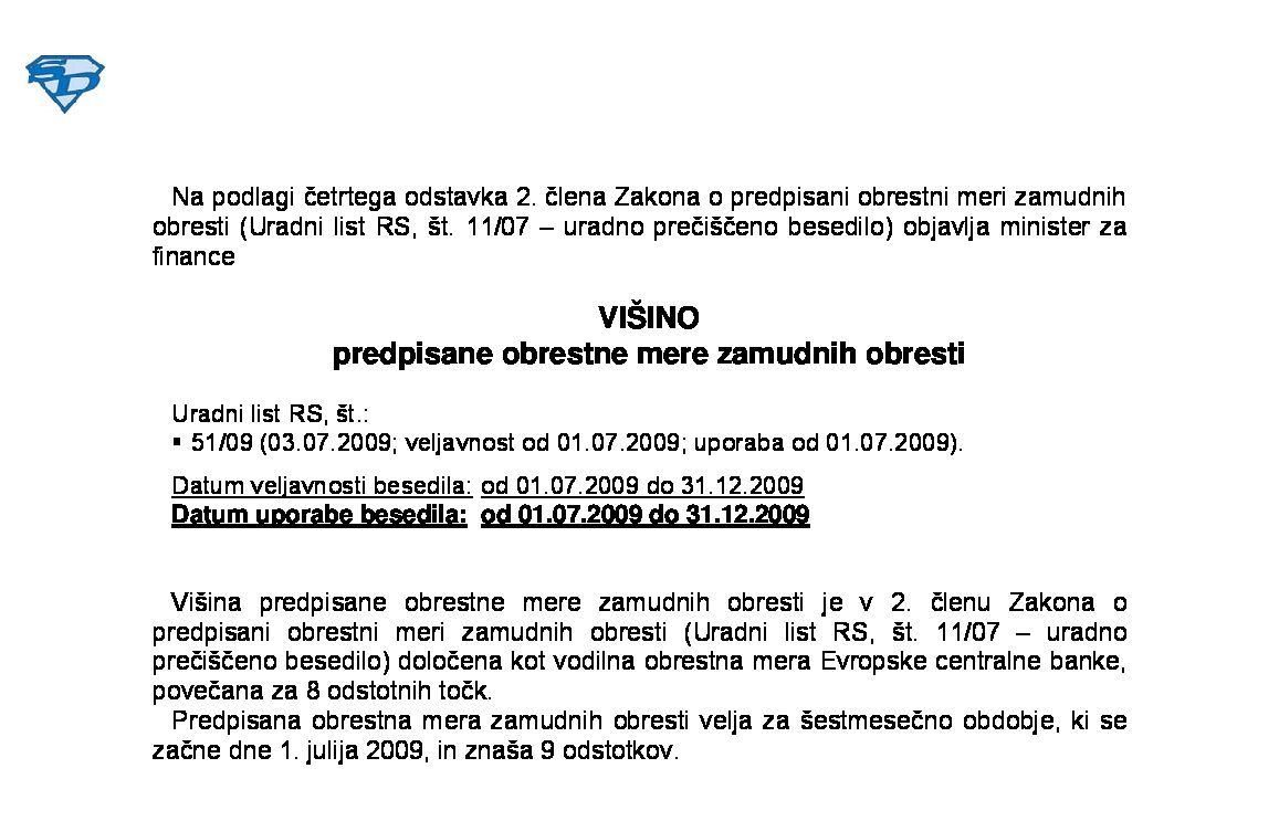Predpisana obrestna mera, skladno z drugim odstavkom 2. člena Zakona o predpisani obrestni meri zamudnih obresti, velja za šestmesečno obdobje, ki se začne s 1. januarjem oziroma 1. julijem. Članek nima prilog!