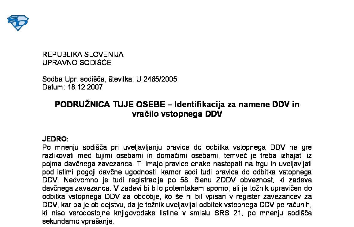 IZPOLNJEVANJE POGOJEV ZA DOBAVO BLAGA ZNOTRAJ UNIJE, OPROŠČENO PLAČILA DDV NA PODLAGI 46. ČLENA ZDDV-1 – Nepopolne CMR listine (I U 1704/2021-38) 27.11.2024 15.10.2025