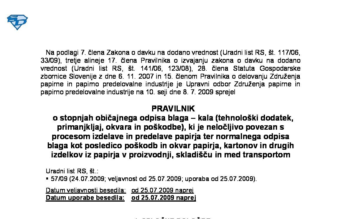 Pravilnik o stopnjah običajnega odpisa, primanjkljaja in uničenja blaga (kalo, razsip, razbitje in okvara), ki sta neločljivo povezana s skladiščenjem in prevozom blaga - GZS - TEKSTILNA, OBLAČILNA IN USNJARSKOPREDELOVALNA INDUSTRIJA 24.01.2009 20.01.2009