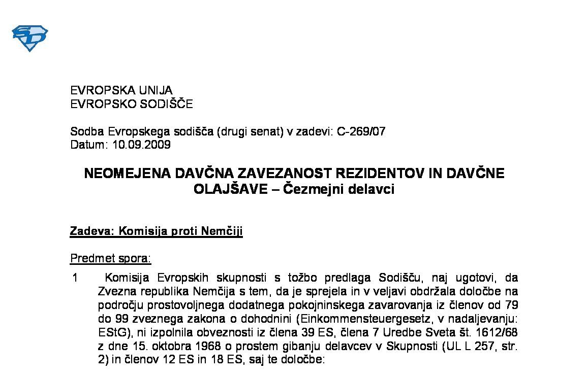 DAVEK NA DOHODEK IN DAVČNI DOBROPIS ZA UPOKOJENCE – Posedovanje potrdila o davčnem odtegljaju, ki ga izda nacionalna uprava (C-300/15) 26.05.2016 01.06.2016