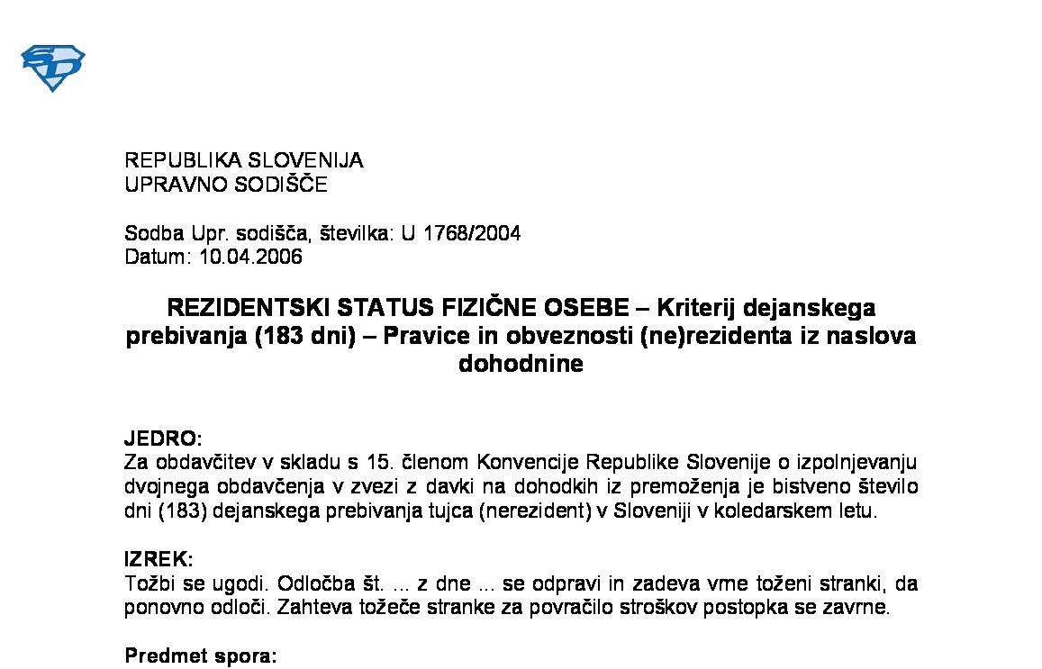 UGOTAVLJANJE REZIDENTSKEGA STATUSA – Dvojno rezidentstvo – Rezidentstvo po KIDO in po ZDoh-2 ( I U 609/2021-7) 17.05.2024 10.06.2025