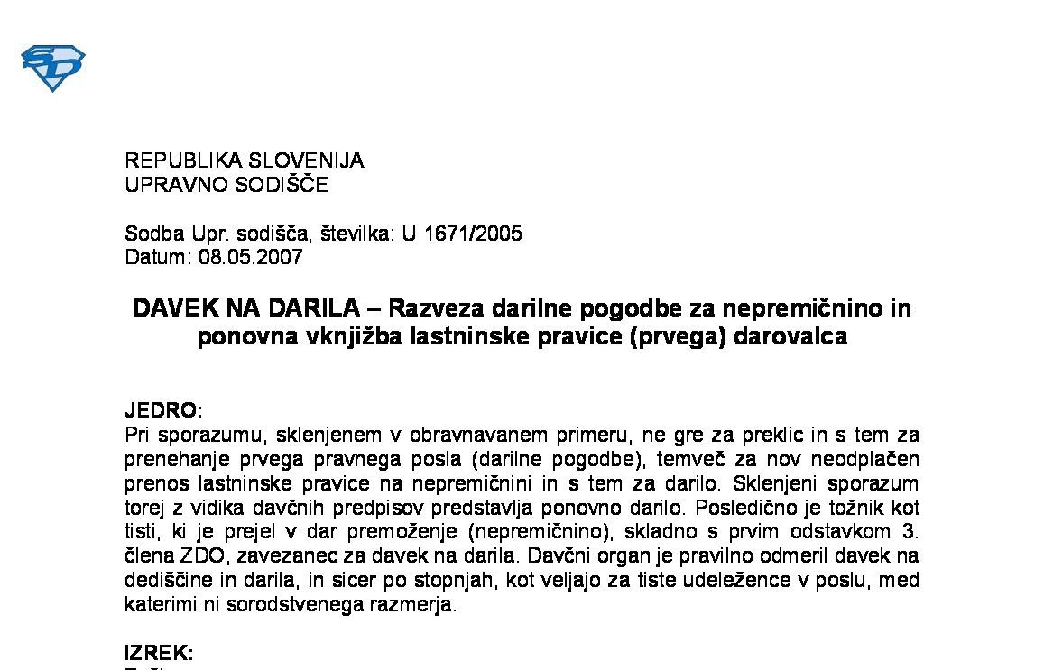 PREJEM POSLOVNEGA DELEŽA V DRUŽBI OB ANGAŽIRANJU PRI SANACIJI DRUŽBE – Darilo, ki se obdavčuje po ZDDD, ali dohodek obdavčen po ZDoh-2 (I U 1495/2022-13) 20.11.2024 10.07.2025