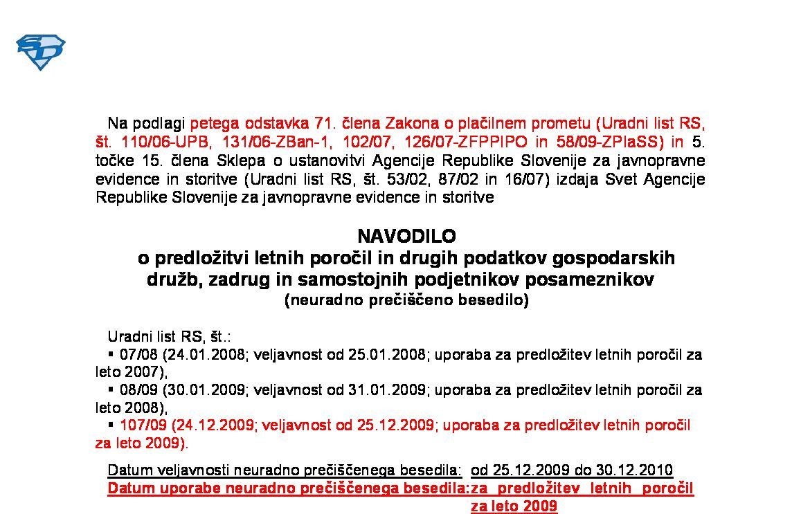 Navodilo o predložitvi letnih in zaključnih poročil ter drugih podatkov poslovnih subjektov (NUPB - neuradno prečiščeno besedilo) 23.12.2017 10.01.2018