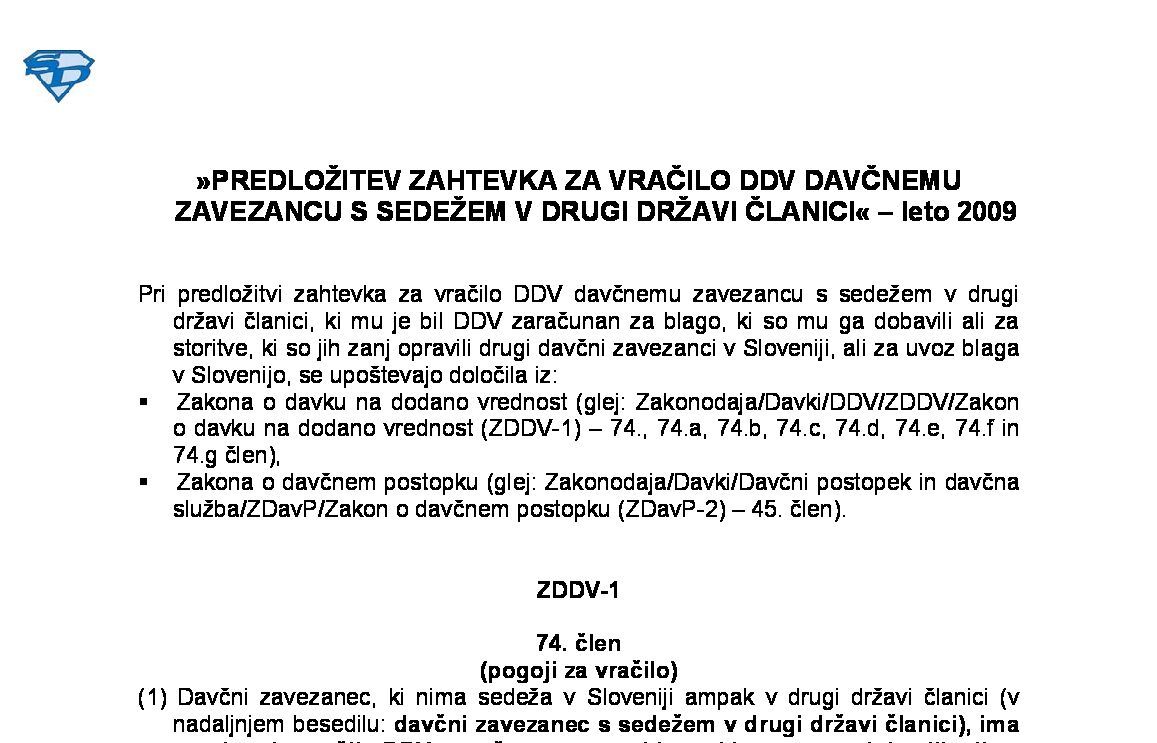 PREDLOŽITEV ZAHTEVKA ZA VRAČILO DDV DAVČNEMU ZAVEZANCU S SEDEŽEM V SLOVENIJI, KI IMA PRAVICO DO VRAČILA V DRUGI DRŽAVI ČLANICI - leto 2024 30.01.2025