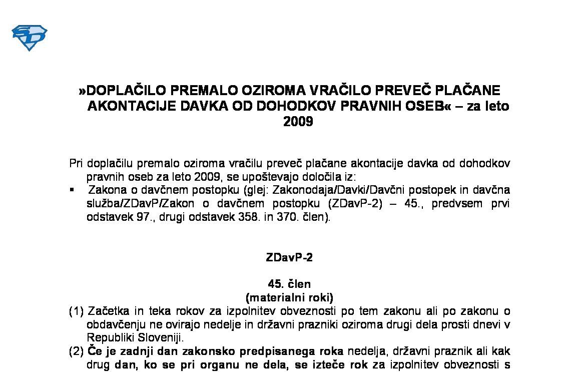 DOPLAČILO PREMALO OZIROMA VRAČILO PREVEČ PLAČANE AKONTACIJE DAVKA OD DOHODKOV PRAVNIH OSEB (DDPO) - za leto 2024 03.12.2024