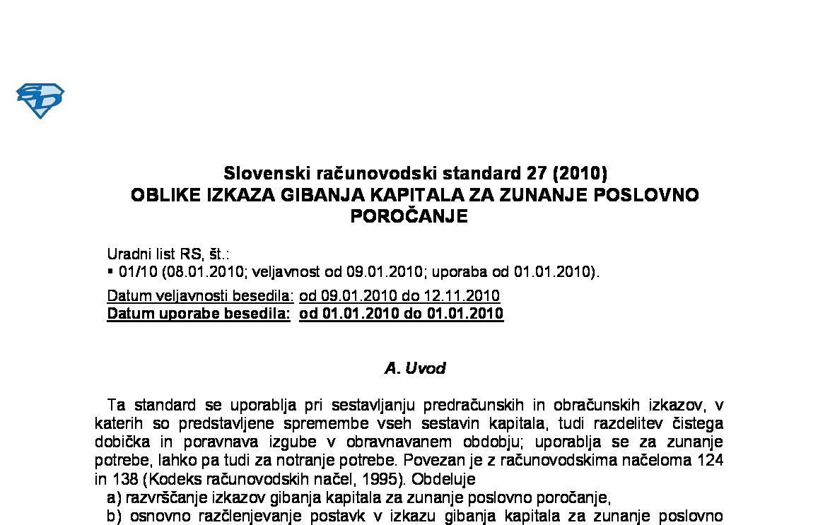 Podjetja, ki imajo poslovno leto enako koledarskemu začnejo standard uporabljati s 1. januarjem 2010, preostala podjetja pa s prvim poslovnim letom, ki se začne po tem datumu. SRS 27 (2006) je z objavo popravka v UL RS, št. 90/10 z dne 12.11.2010 popravljen. |