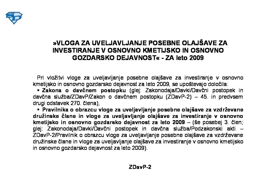 VLOGA ZA UVELJAVLJANJE POSEBNE OLAJŠAVE ZA INVESTIRANJE V OSNOVNO KMETIJSKO IN OSNOVNO GOZDARSKO DEJAVNOST - ZA leto 2025 21.01.2026