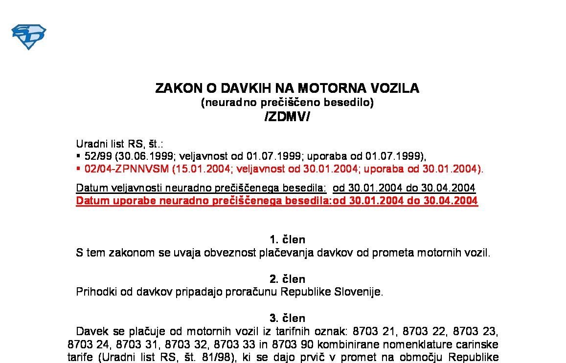 ZAKON O DAVKU NA MOTORNA VOZILA (ZDMV - neuradno prečiščeno besedilo) 01.07.2012 31.12.2020 06.06.2012