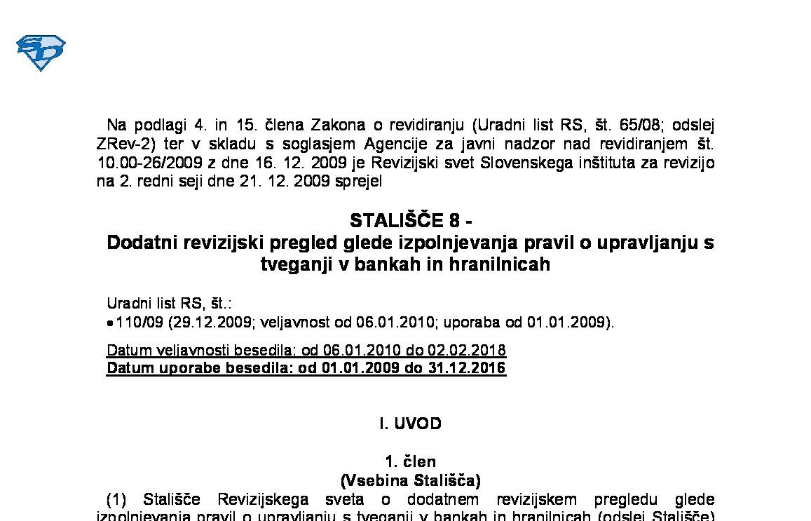 Uporabljati se začne pri revidiranju računovodskih izkazov in pregledu letnih poročil bank in hranilnic za leto 2009.