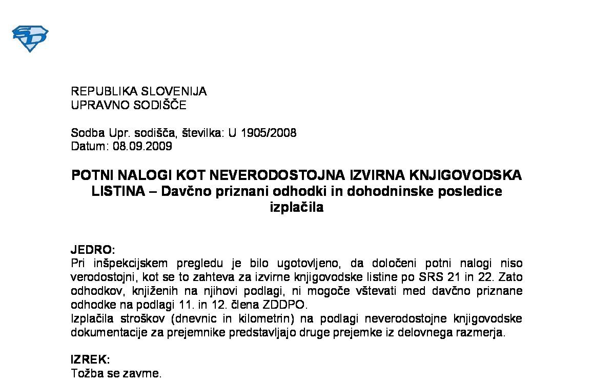 VERODOSTOJNA KNJIGOVODSKA LISTINA – Potni nalog – Dokazovanje nastanka poslovnega dogodka (I U 1898/2021-11) 21.05.2024 14.04.2025