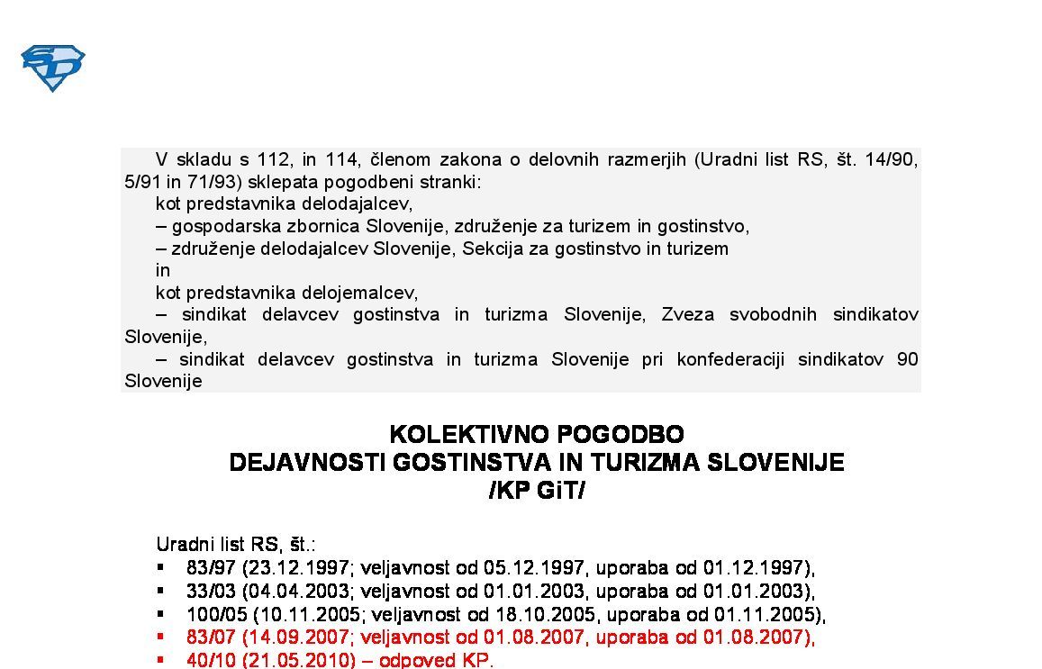 Posebnost glede uporabe po odpovedi KP iz UL RS, št. 40/10: Skladno s tretjim odstavkom 83. člena Kolektivne pogodbe dejavnosti gostinstva in turizma se normativni del kolektivne pogodbe uporablja do sklenitve nove vendar največ devet mesecev. |