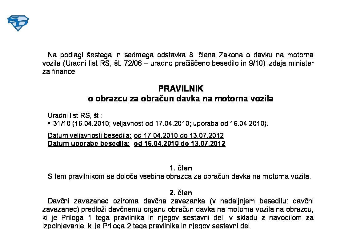 | Pravilnik o obrazcu za obračun davka na motorna vozila in dodatnega davka na motorna vozila | 14.07.2012 | 31.12.2020 | 16.07.2012 | |
