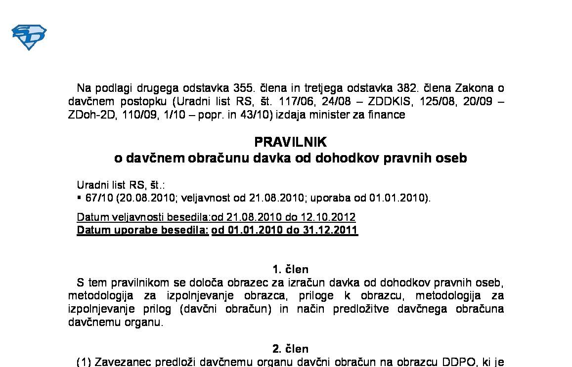 Pravilnik se uporablja za obračun DDPO, ki vključuje obdobje od 1. januarja 2010 dalje in se davčni obračun predlaga po dnevu uveljavitve tega pravilnika. Priloga 1 - Obrazec DDPO.pdf