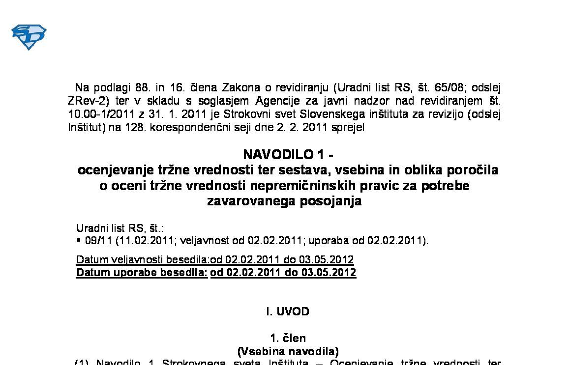 Navodilo 1 začne veljati z dnem objave na spletnih straneh Slovenskega inštituta za revizijo. Priloga 1 - Ocena tržne vrednosti nepremičninskih pravic.pdf