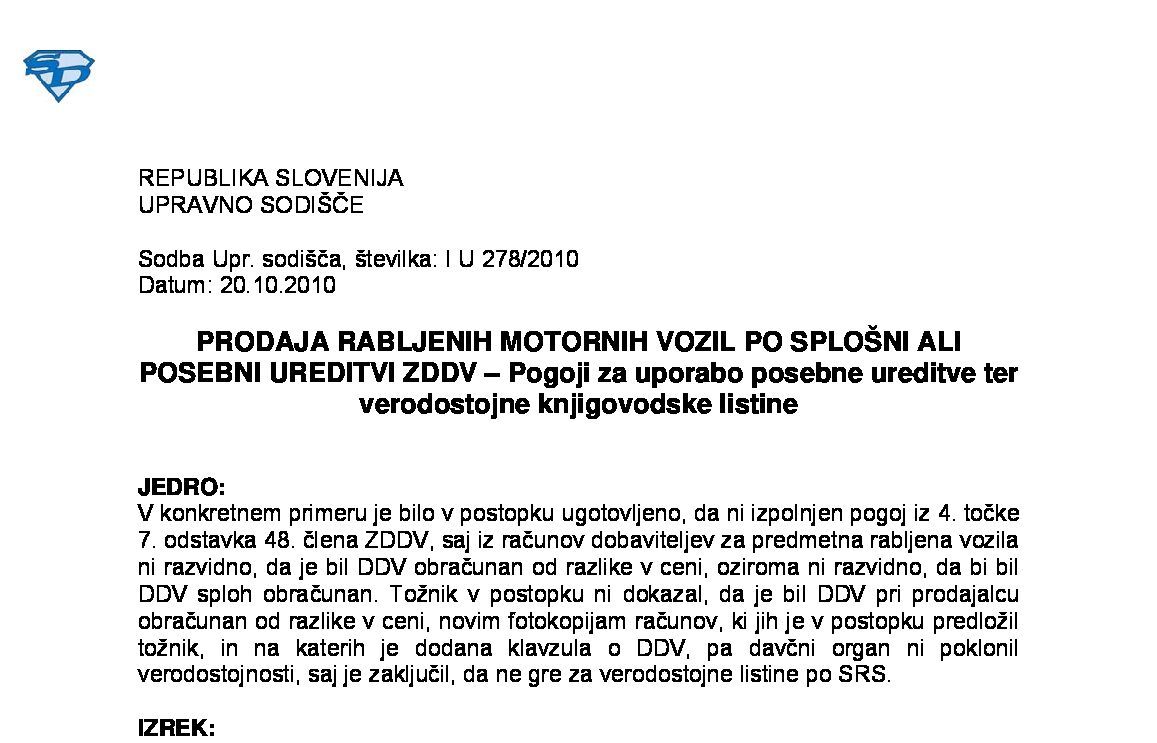 PRIDOBITEV VOZILA – PREDPLAČILO ZA PRIHODNJO PRODAJO VOZILA – Pridobitev novega ali rabljenega vozila (I U 1443/2022-29) 23.10.2024 19.03.2025