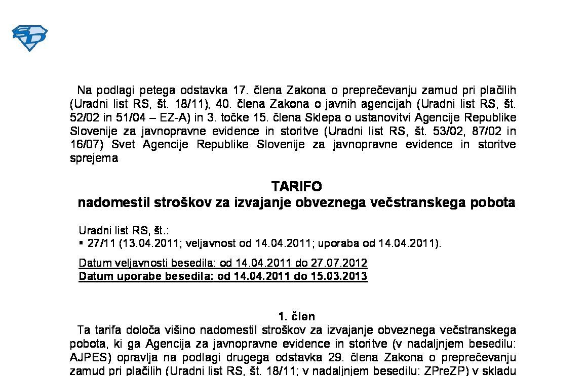 | Tarifa nadomestil stroškov za izvajanje obveznega večstranskega pobota (NUPB - neuradno prečiščeno besedilo) | 09.08.2023 | 01.08.2023 | ||