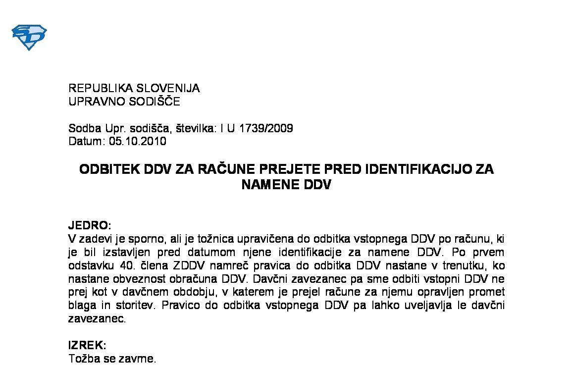 IZPOLNJEVANJE POGOJEV ZA DOBAVO BLAGA ZNOTRAJ UNIJE, OPROŠČENO PLAČILA DDV NA PODLAGI 46. ČLENA ZDDV-1 – Nepopolne CMR listine (I U 1704/2021-38) 27.11.2024 15.10.2025