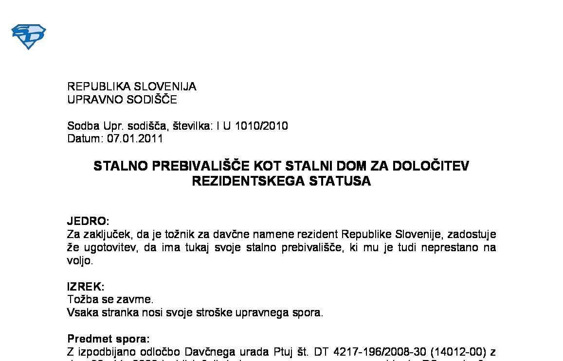 UGOTAVLJANJE REZIDENTSKEGA STATUSA – Dvojno rezidentstvo – Rezidentstvo po KIDO in po ZDoh-2 ( I U 609/2021-7) 17.05.2024 10.06.2025